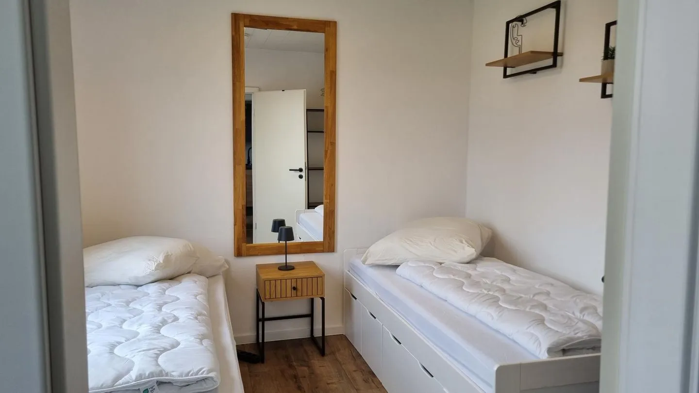 Das Haus bietet Platz für bis zu 4 Personen. Die Schlafzimmer sind liebevoll gestaltet und vermitteln Ruhe und Behaglichkeit. Dank praktischer Schranklösungen und komfortabler Betten fühlen sich auch längere Aufenthalte angenehm und unbeschwert an. Das Badezimmer ist funktional und gepflegt, sodass man sich schnell wie zuhause fühlt.