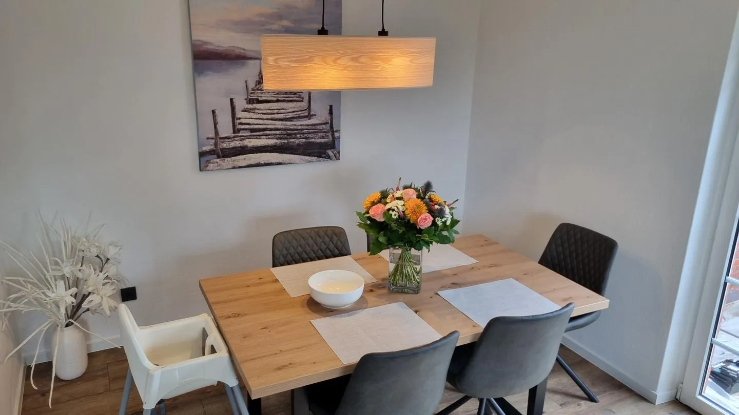 Im Inneren empfängt das Friesenengel seine Gäste mit einer gemütlichen, wohnlichen Ausstattung, die sofort Wohlfühlatmosphäre vermittelt. Der Wohnbereich bietet bequeme Sitzmöbel, TV, WLAN sowie direkten Zugang zur Terrasse. Große Fenster lassen viel Tageslicht hinein und verbinden Drinnen und Draußen auf angenehme Weise. Die angrenzende Küche ist vollständig ausgestattet und bietet alles für gemeinsame Mahlzeiten – vom morgendlichen Frühstück bis zum entspannten Kochabend.
