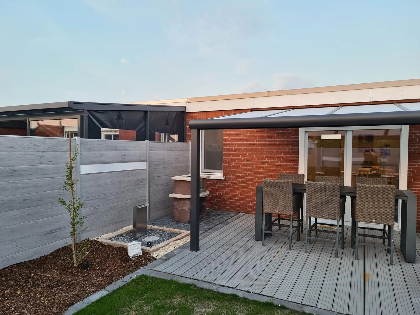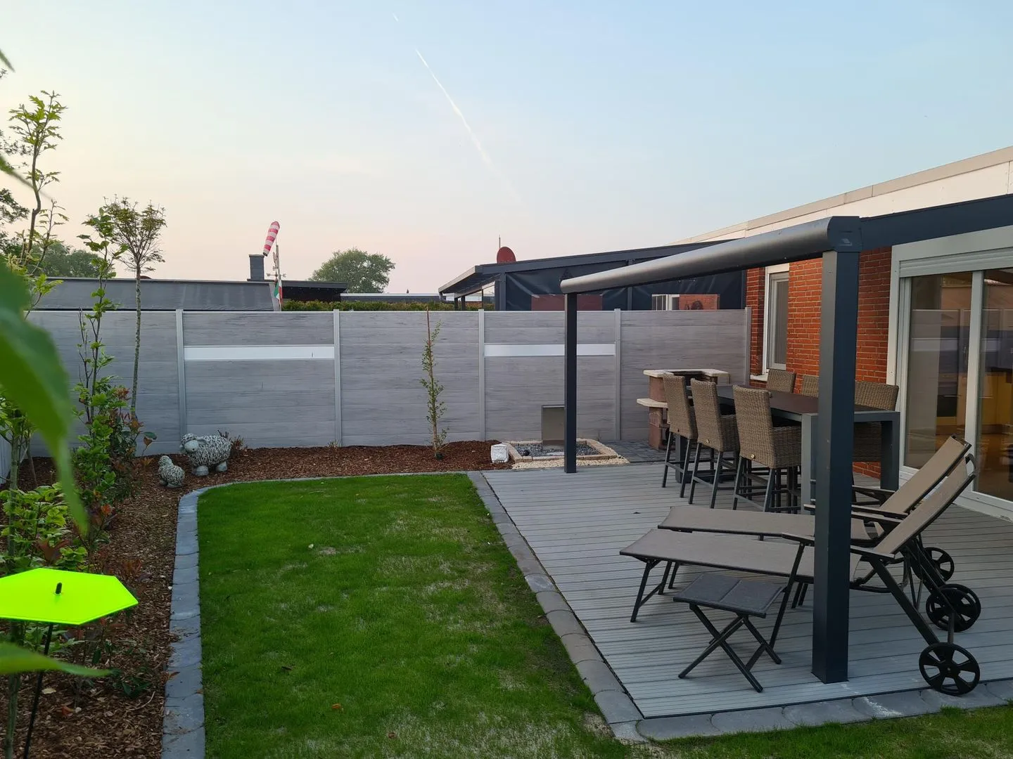 Der komplett eingezäunte, sichtgeschützte Garten bietet maximale Privatsphäre und Sicherheit – perfekt für Vierbeiner, die frei schnüffeln dürfen, und für Gäste, die ungestört entspannen möchten. Auf der Terrasse stehen Gartenmöbel bereit, um sonnige Stunden gemütlich zu genießen.