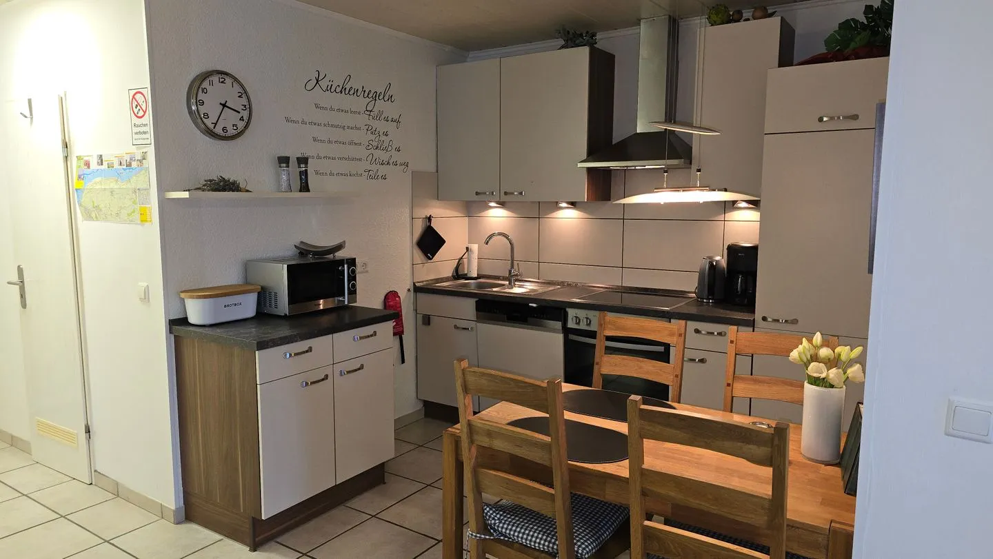 Der Wohnbereich ist gemütlich eingerichtet und verfügt über eine integrierte Küchenzeile, die eine unkomplizierte Selbstversorgung ermöglicht. Ein separates Schlafzimmer bietet erholsame Nächte, während das Badezimmer mit Dusche und WC den täglichen Komfort ergänzt. Eine Waschmaschine steht ebenfalls zur Verfügung.