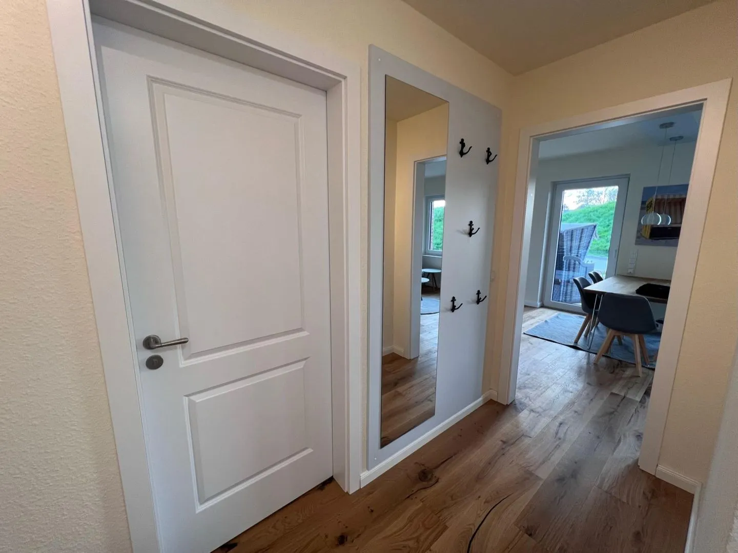 Die Ferienwohnung – eine von zwei Wohneinheiten im Haus – ist sehr gut ausgestattet. Vom Eierkocher über Kaffee- und Spülmaschine bis hin zur Waschmaschine finden Sie alles, was Sie für einen entspannten Aufenthalt benötigen. Frees Moi verfügt über eine moderne Wohnküche mit hochwertigen Einbaumöbeln, einen gemütlichen Essplatz sowie bodentiefe Fenster, die direkten Zugang zur Terrasse bieten. Genießen Sie hier Ihr Abendessen bei schönem Wetter an der frischen Nordseeluft – so fühlt sich Urlaub an der ostfriesischen Küste an.