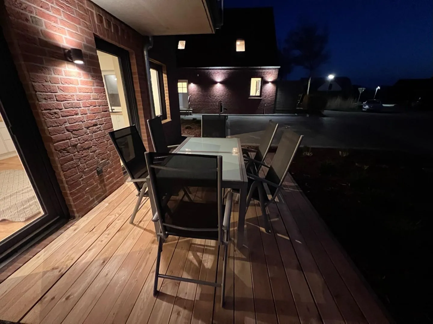 Das Wohnzimmer überzeugt mit einer gemütlichen, modernen Ausstattung. Eine hochwertige Couch, warme Farben und große Fenster schaffen ein helles, freundliches Ambiente. Der offene Wohnbereich lädt zum Entspannen ein und bietet viel Komfort für erholsame Stunden nach einem Tag am Strand.