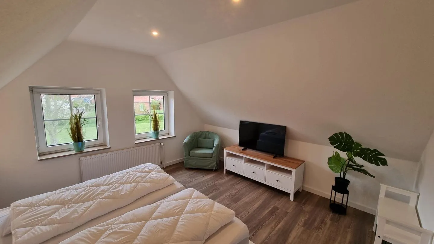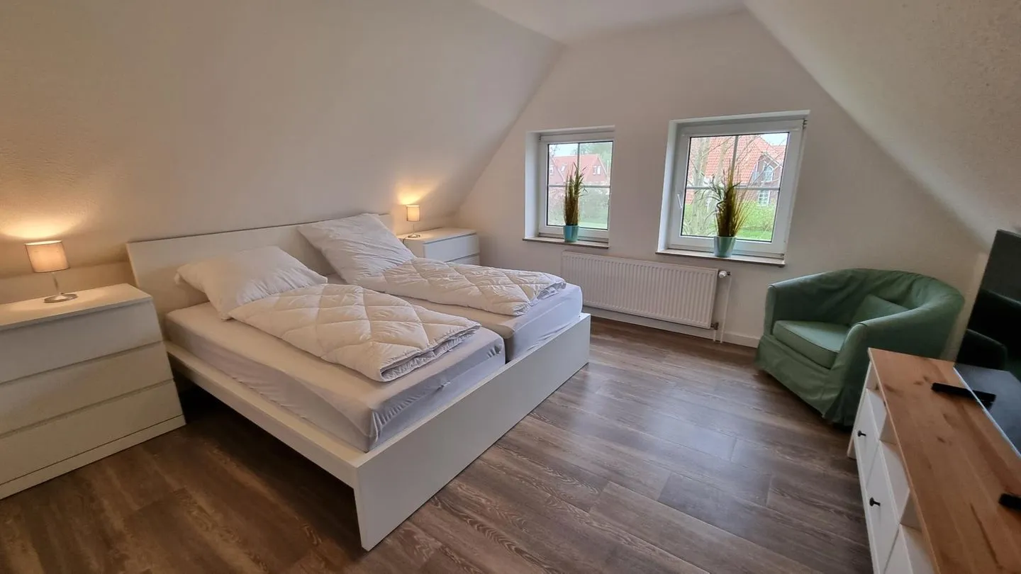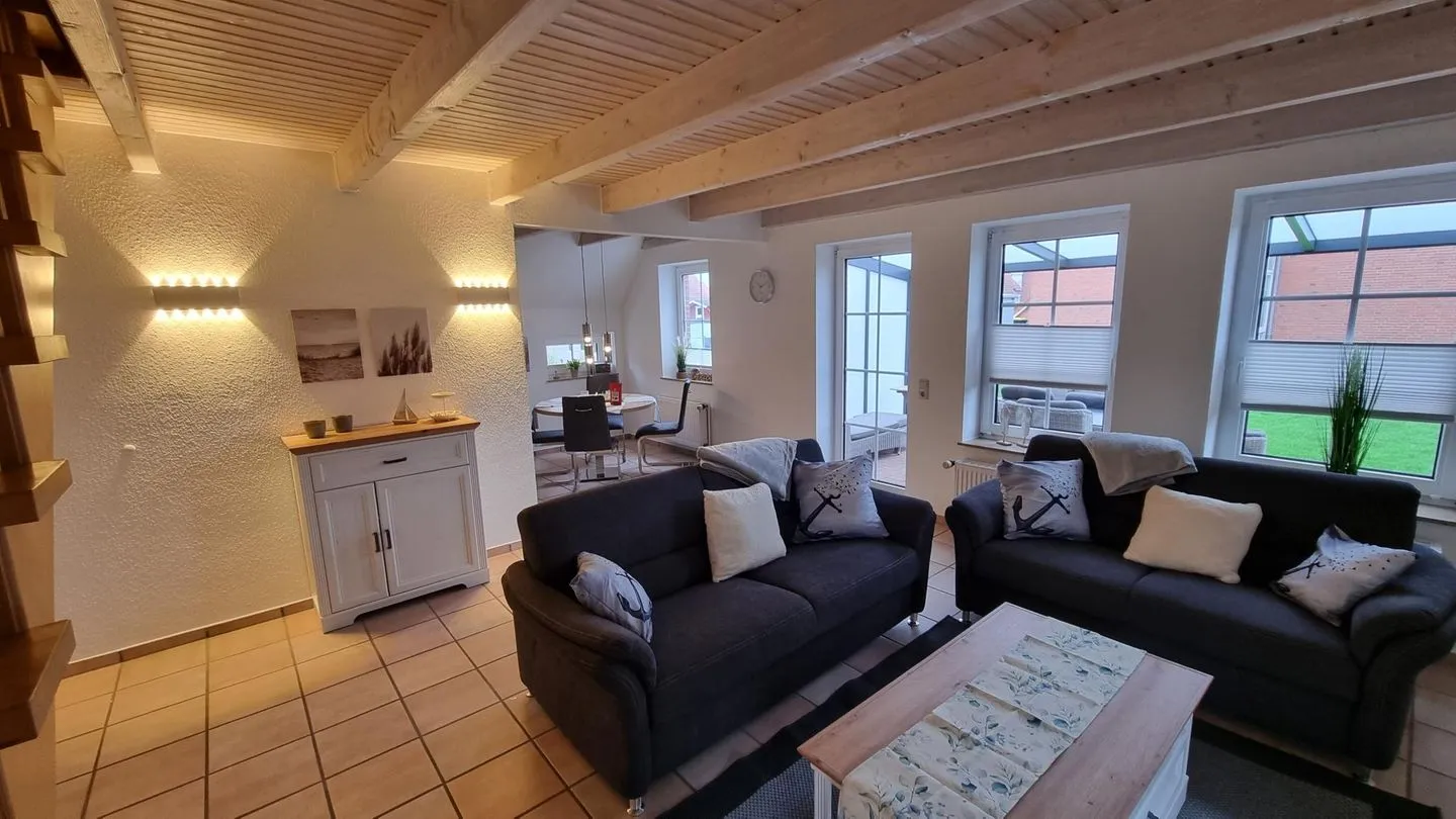 Der Wohnbereich ist freundlich gestaltet und lädt zu erholsamen Stunden nach einem Tag an der frischen Seeluft ein. Die Küche ermöglicht eine unkomplizierte Selbstversorgung während des Aufenthalts. Separate Schlafbereiche sorgen für Rückzugsmöglichkeiten und erholsame Nächte.