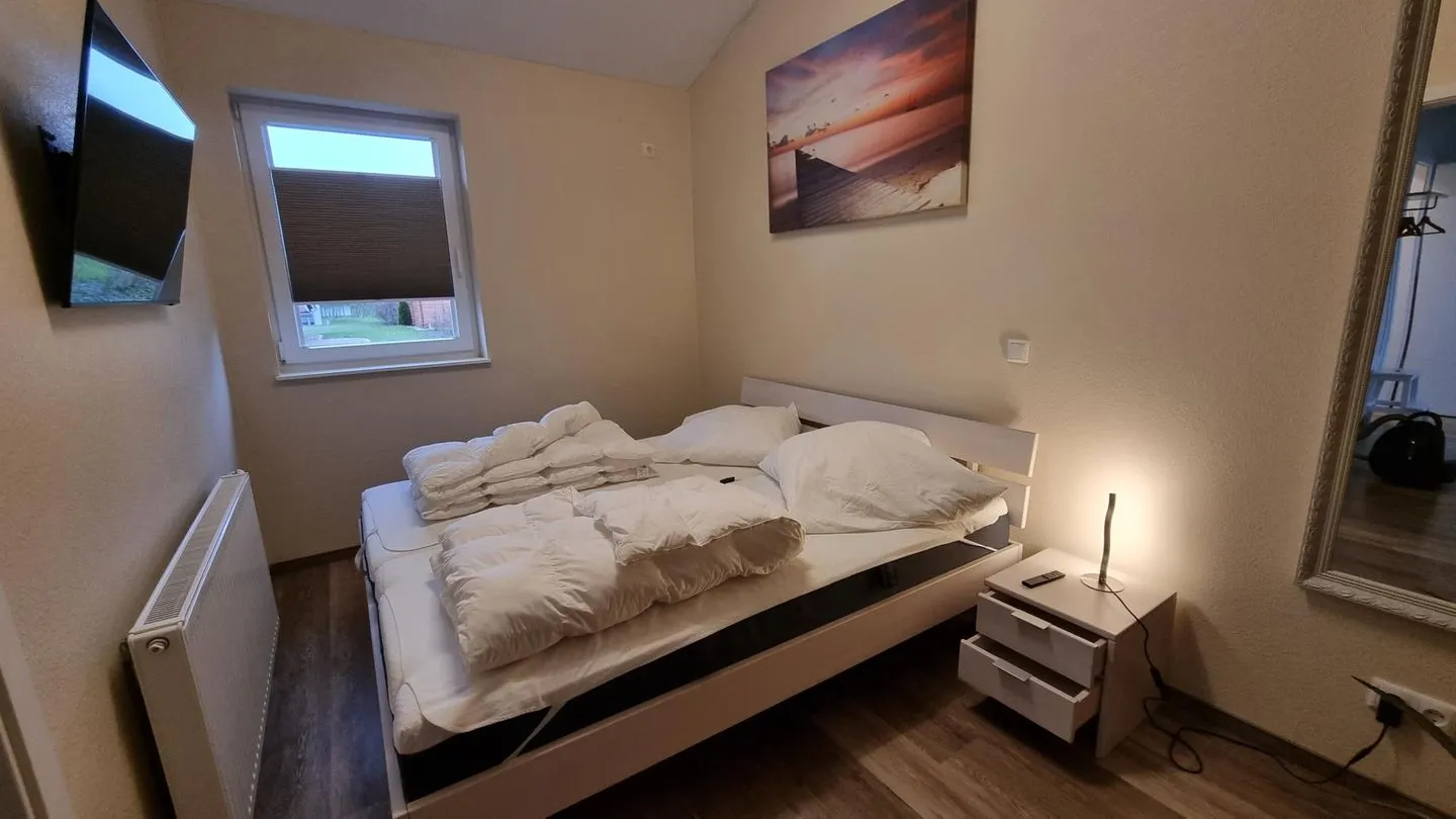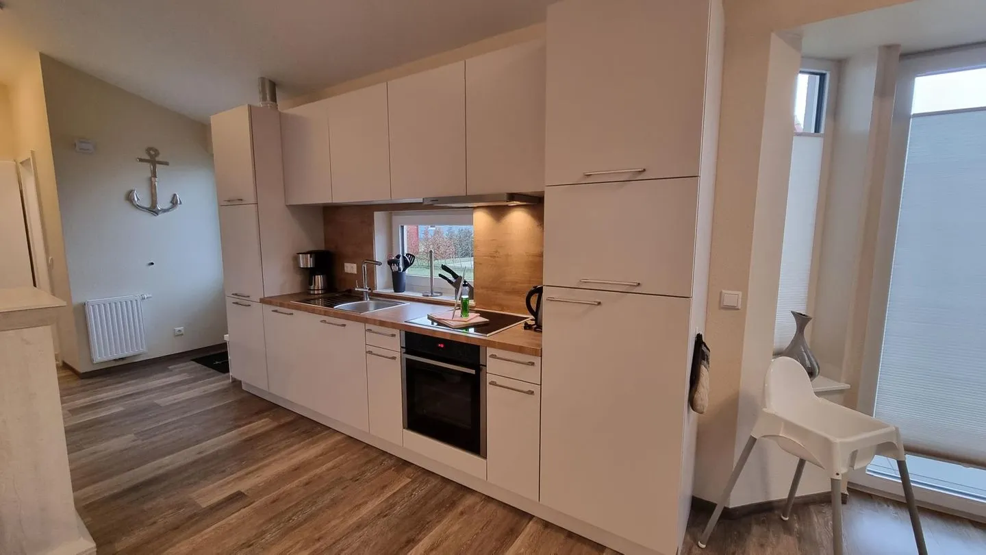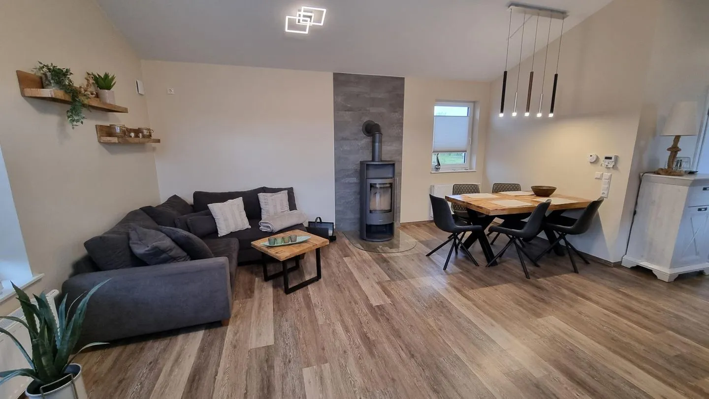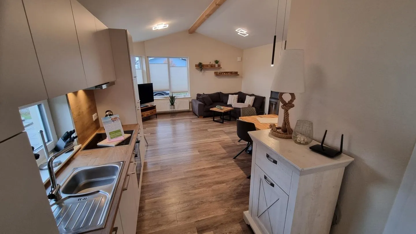 Der offen gestaltete Wohn- und Essbereich ist hell und freundlich eingerichtet und lädt mit seinem Kamin zu gemütlichen Stunden ein. Hochwertige Materialien und eine geschmackvolle Einrichtung schaffen eine angenehme Wohlfühlatmosphäre. Die Küche ermöglicht eine komfortable Selbstversorgung während des Aufenthalts. Separate Schlafbereiche sorgen für erholsame Nächte.